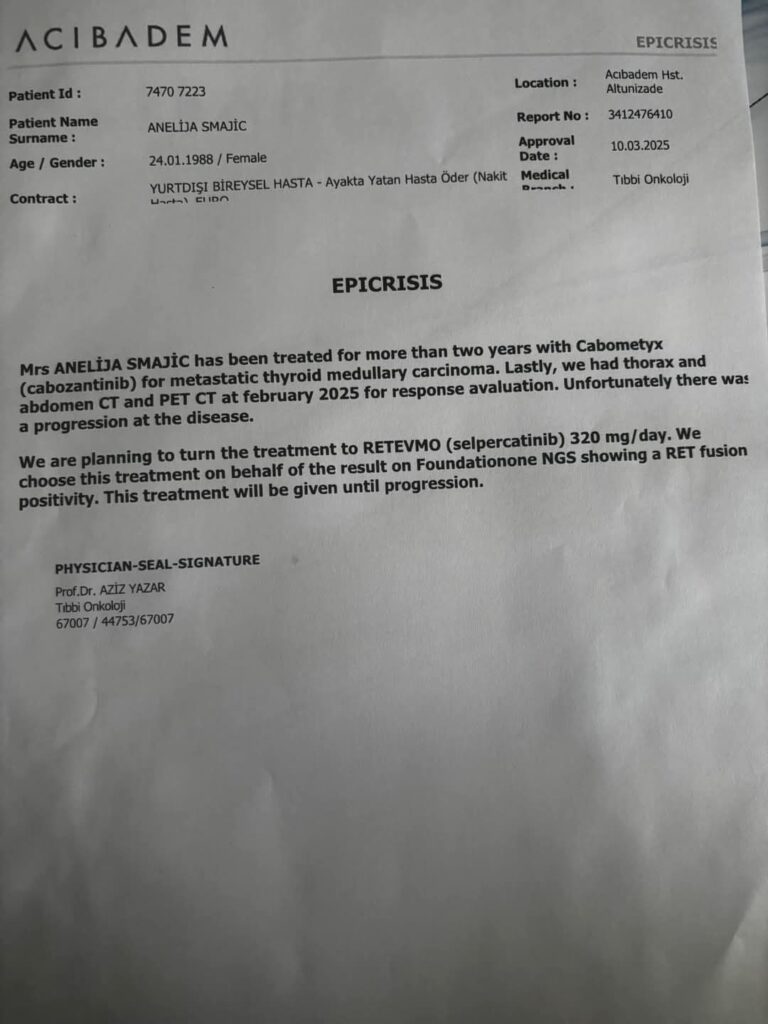 DRAGI MOJI PRIJATELJI PUNO VAS PITA ZA MOJE STANJE HVALA VAM OD SRCA JOS SAM U TURSKOJ NAZALOST MOJI STARI LIJEKOVI SU PRESTALI DJELOVATI MOJE STANJE SE POGORSALO IZNENADA SAD SAM NA RADIO TERAPIJAMA DO PETKA.CIM ZAVRSIM S TERAPIJAMA MORAM NASTAVITI PITI TABLETE RETSEVMO 80MG KOJE JOS POKUSAJEM NABAVITI NAJJEFTINIJE SU OKO 7 HILJADA EURA TRENUTNO U TURSKOJ NEGDJE SU CAK I 11 HILJADA EURA .TO JE KUTIJA ZA JEDAN MJESEC A PIT CU IH GODINAMA KAKO DOKTOR MISLI OD NJIH MI ZAVISI OZDRAVLJENJE MORAM IH POCETI PITI STO PRIJE KAKO CU SKUPIT TOLIKE PARE SVAKI MJESEC ALLAH ZNA I UZDAM SE U DRAGOG ALLAHA DA CE MI DATI NEKI IZLAZ HVALA VAM PUNO SVIMA KO GOD MI JE POMOGAO NA BILO KOJI NACIN NIKAD NIKO NE DOZIVIO SAMO TRAZITE ZDRAVLJE OD DRAGOG ALLAHA SVE OSTALO JE NEBITNO❤️