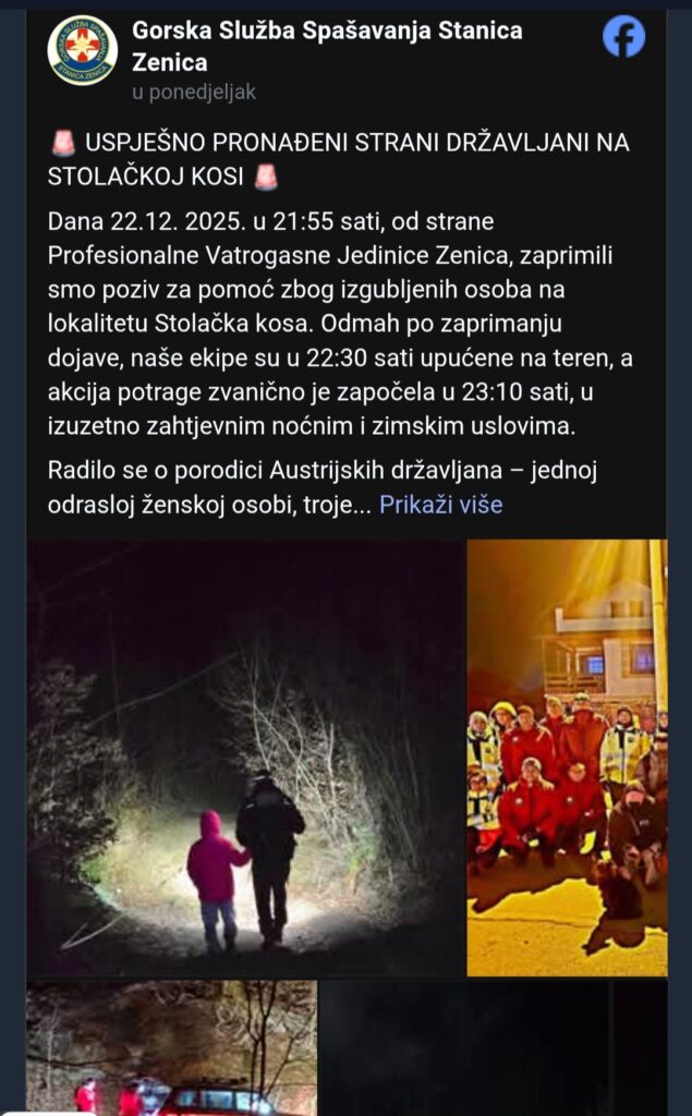 Prava drama odvijala se u noći s 22. na 23. decembar na području između Teslića i Zenice, kada se porodica iz Austrije – žena s troje djece i psom – izgubila u šumskom i teško prohodnom predjelu, nakon što ih je navigacijska aplikacija usmjerila na pogrešan put.