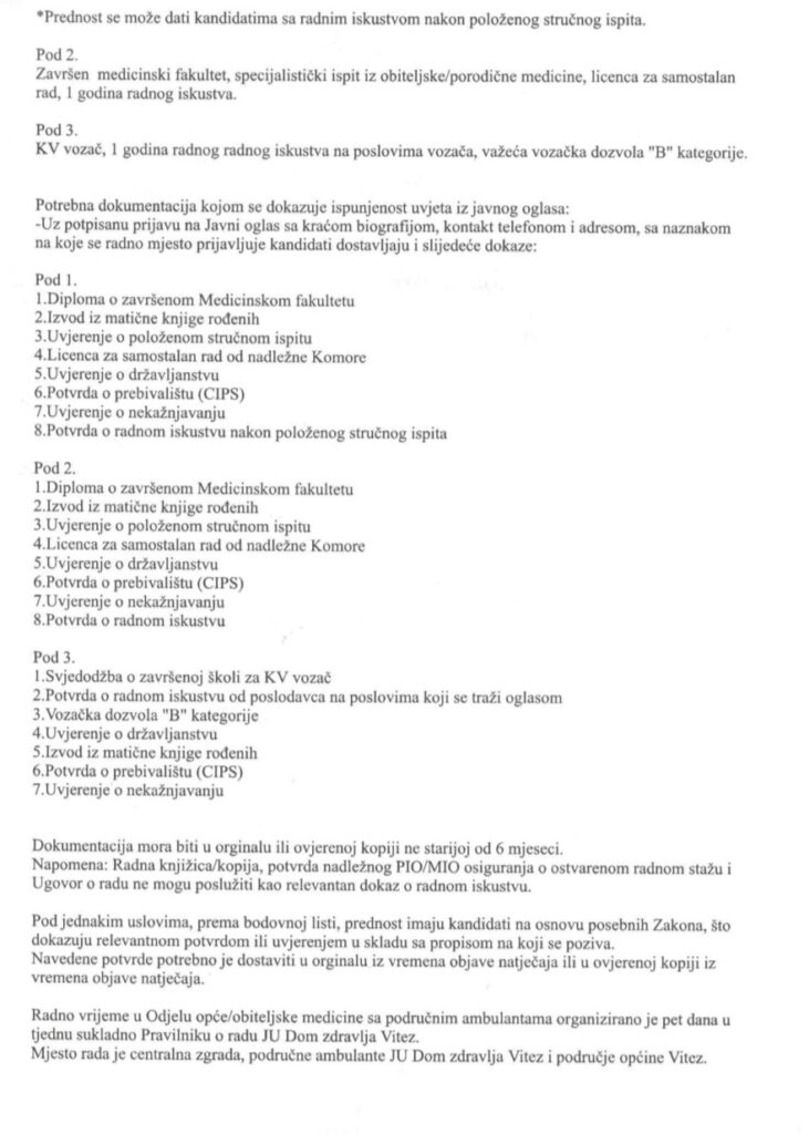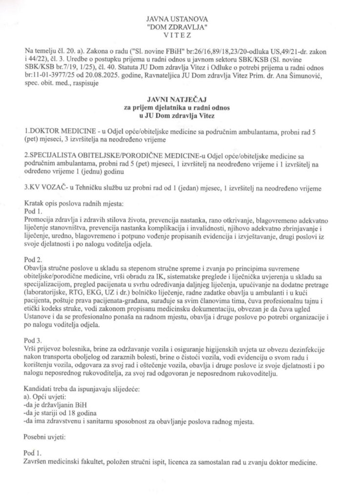 Vijesti, Vitez Raspisan Konkurs za upražnjena radna mjesta, JU Dom Zdravlja Vitez JU Dom Zdravlja Vitez raspisao je Konkurs za upražnjena radna mjesta: 1.Doktor medicine 2.Specijalista porodične medicine 3.KV Vozač